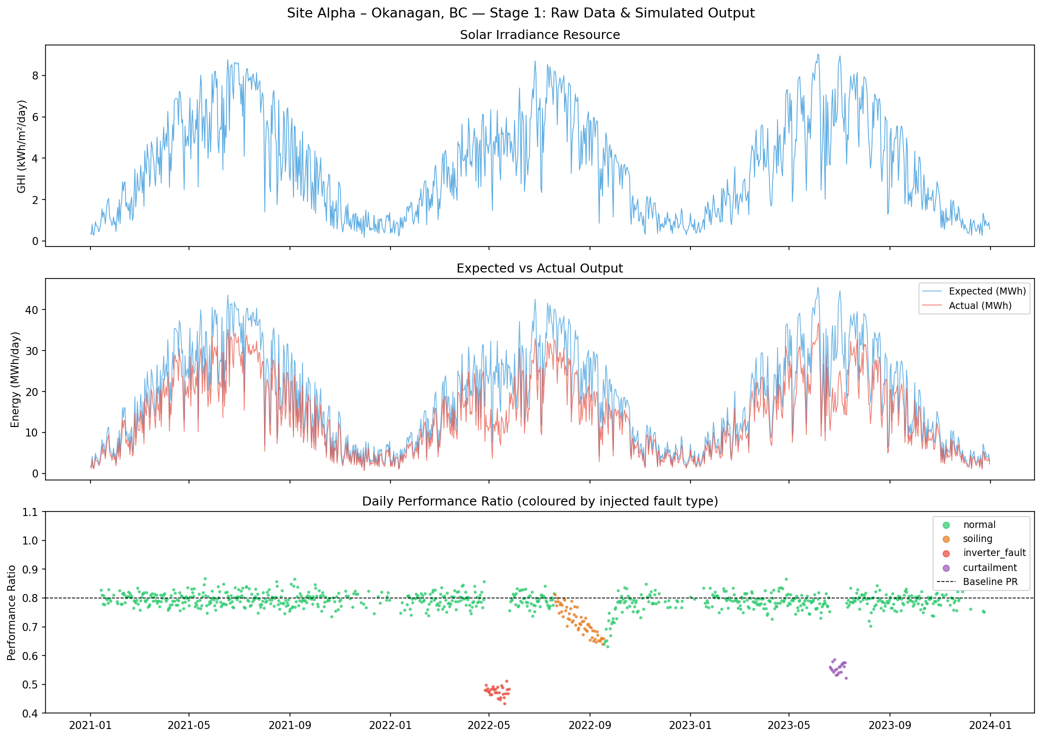 Site Alpha — 3-year simulated output: daily irradiance, expected vs actual energy (MWh), and Performance Ratio coloured by injected fault type.