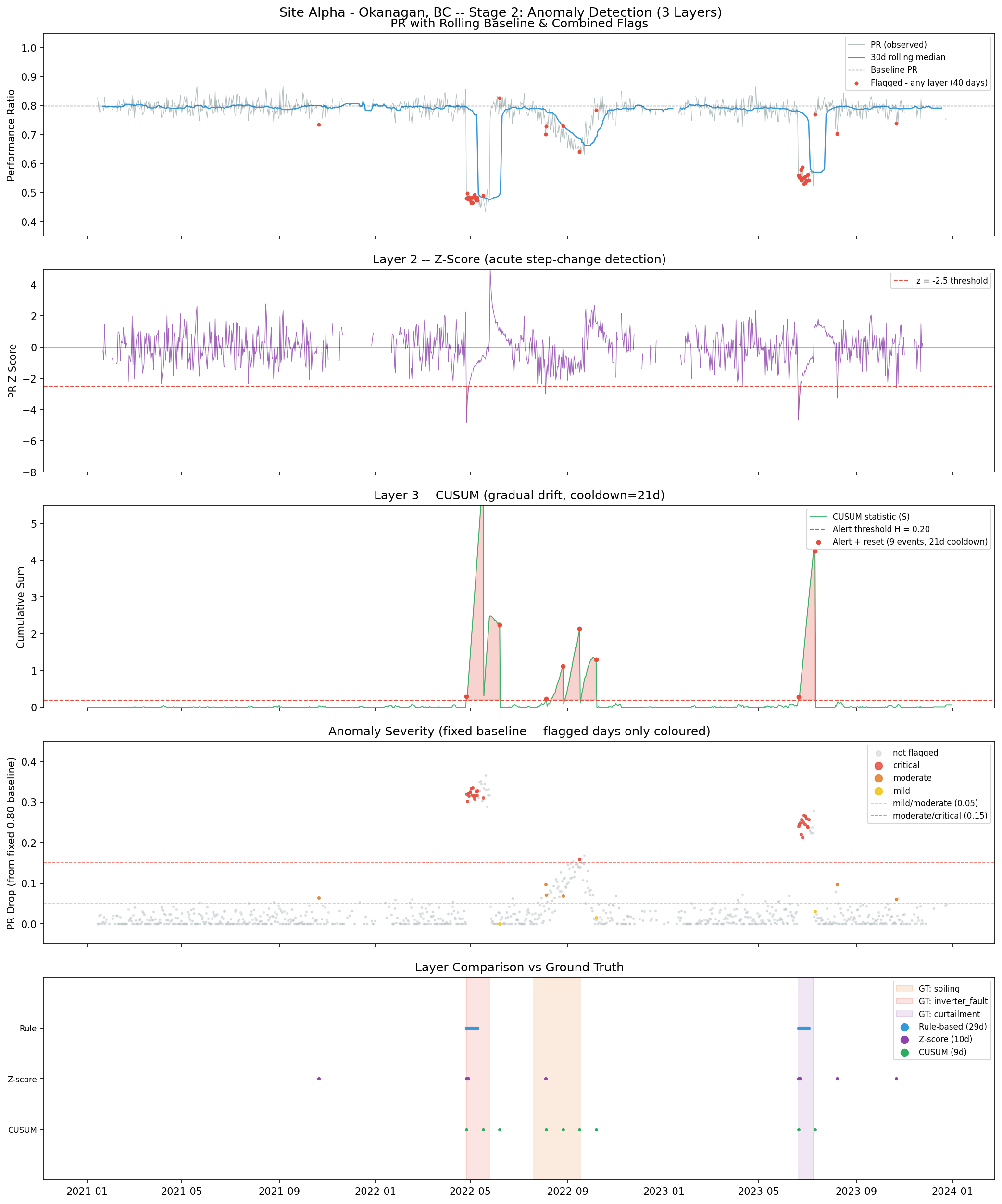 For severe events all three layers fire simultaneously, making layer fractions similar across fault types. Episode shape is more diagnostic: soiling produces a gradual ramp (min_pr << mean_pr); inverter failure produces a sudden flat floor (min_pr ≈ mean_pr).