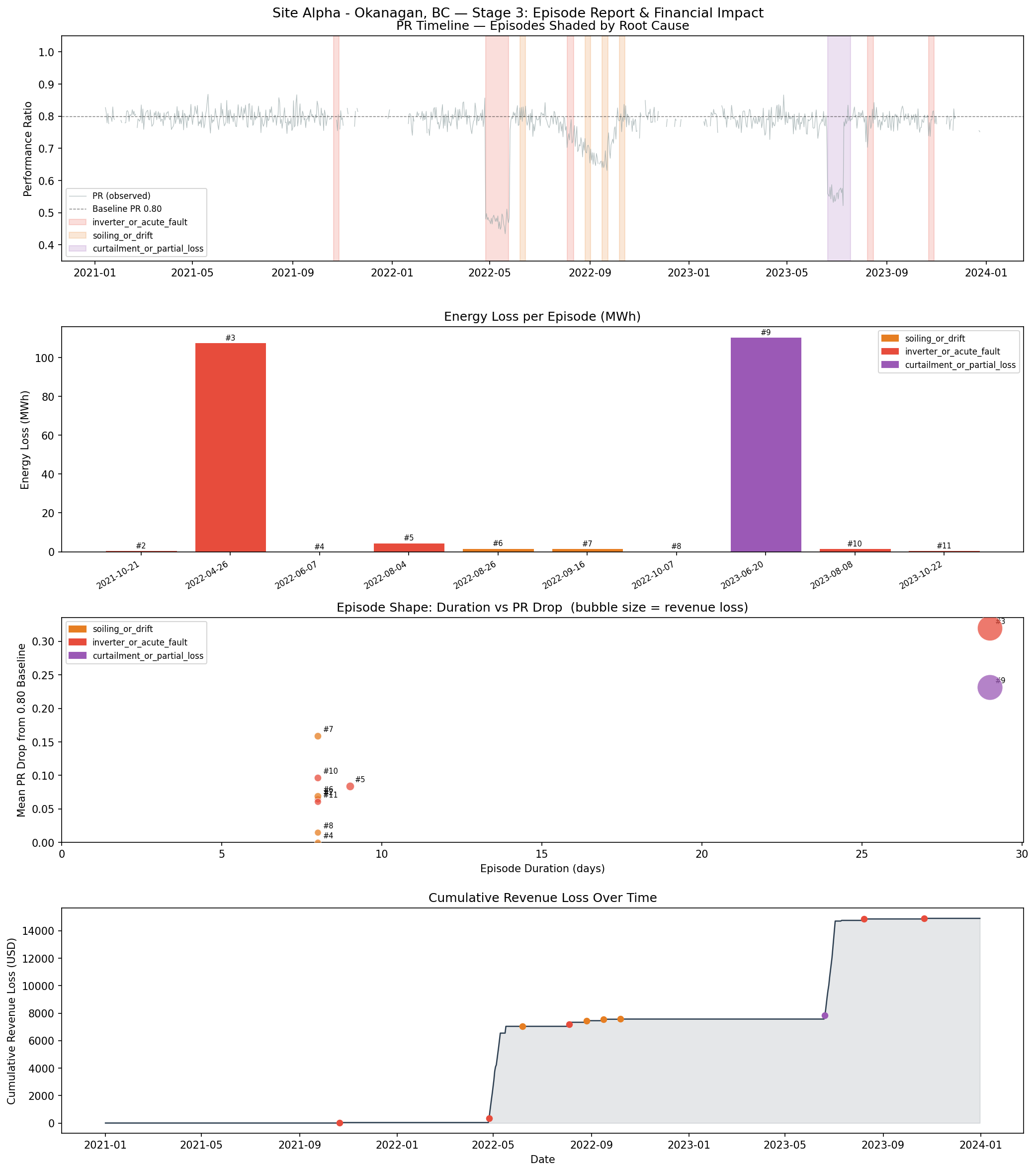 Group flagged days into fault episodes; root cause classification; revenue loss