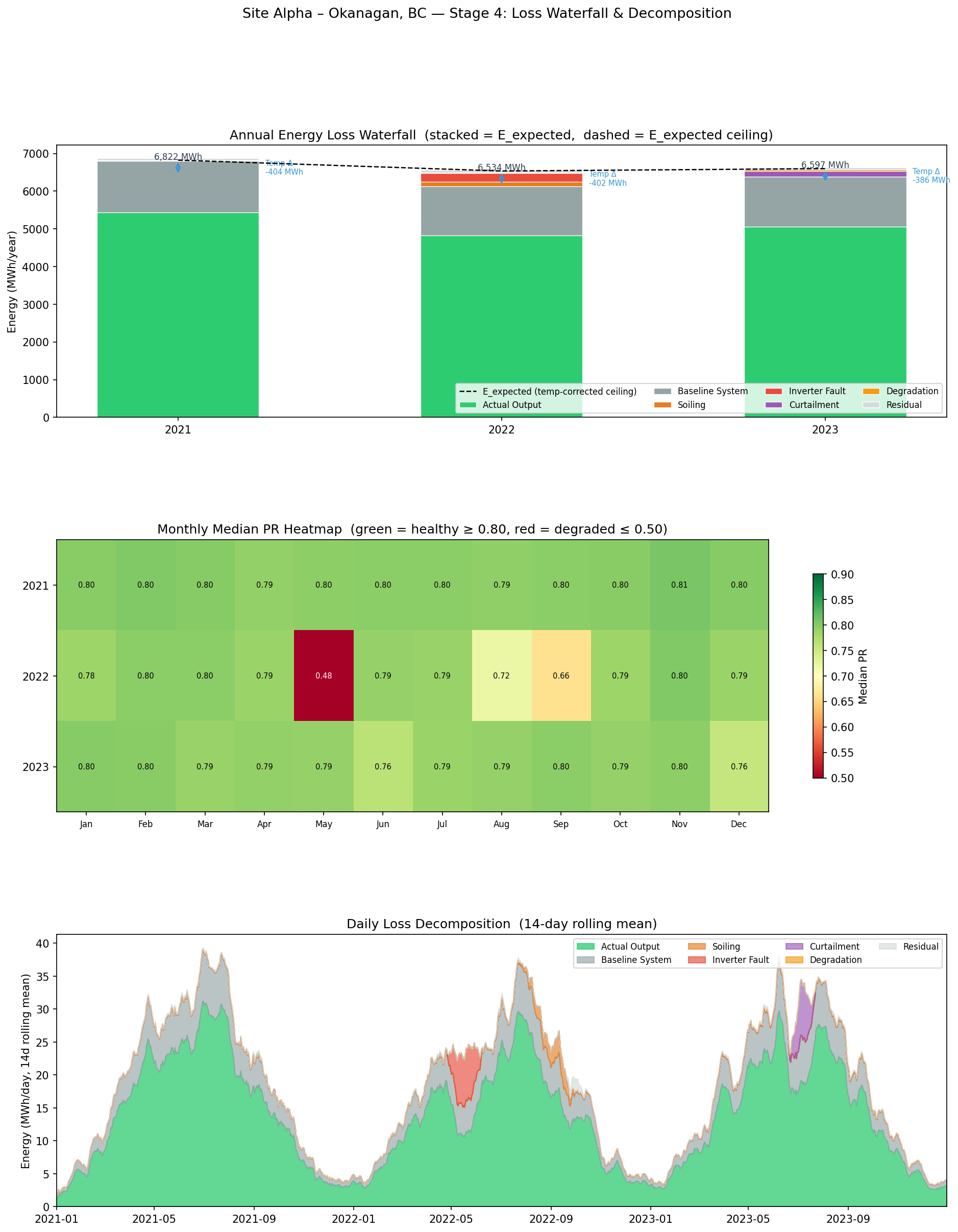 Single-site Stage 4. The loss waterfall only runs for Alpha. In a production system, you'd run it for every site in the fleet and use the decomposition to rank O&M spend (e.g., "panel cleaning is cost-justified at Beta because annual soiling loss exceeds cleaning cost").